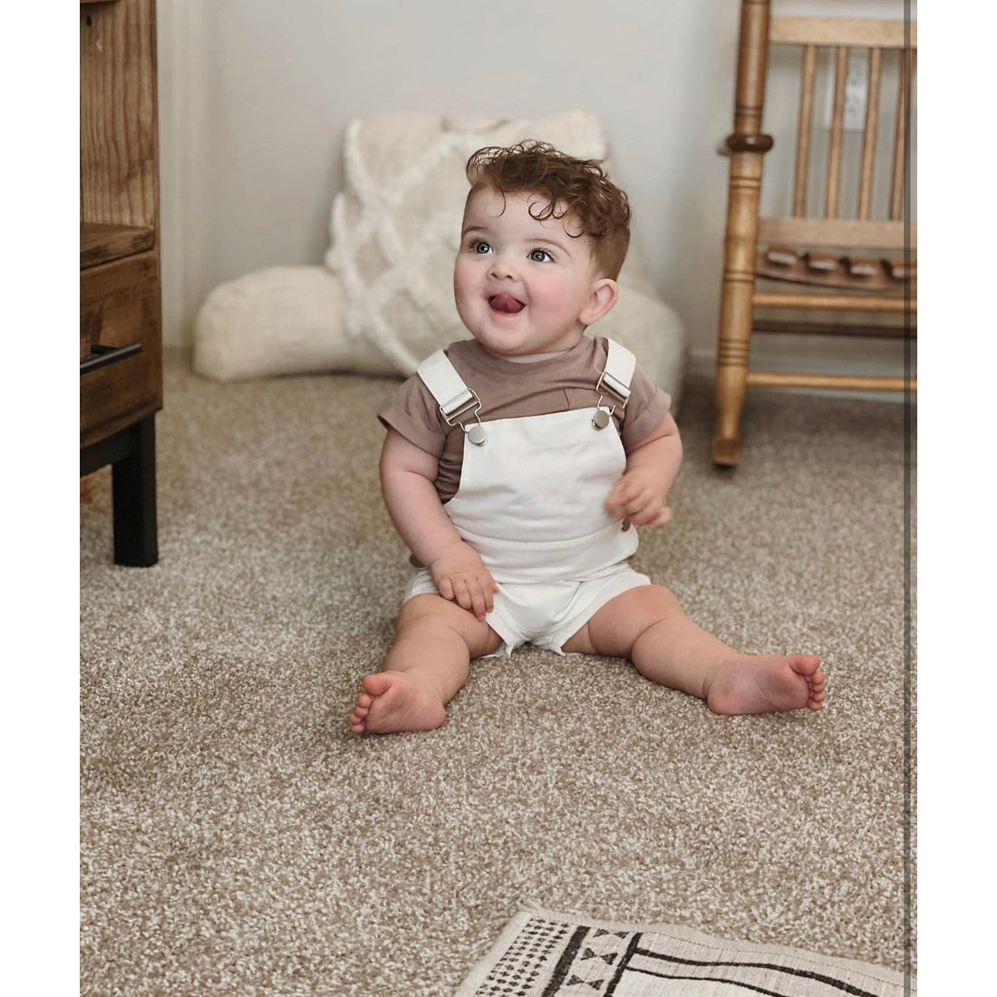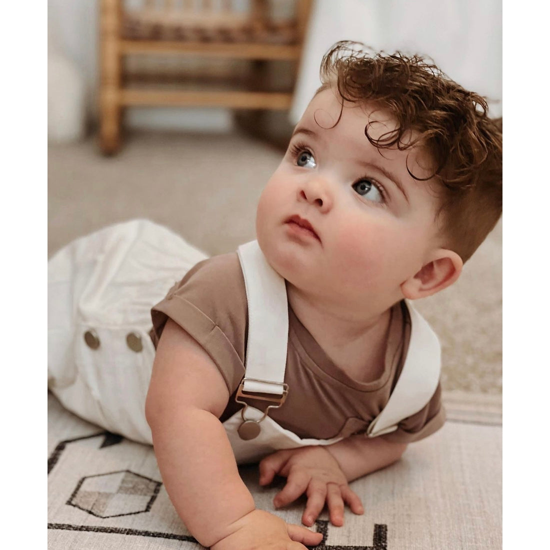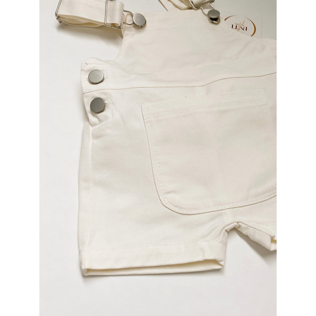 Harem style short overalls with large lower center pocket, fitted leg and wider hip. Longer straps with buckle to make adjusting fit easy! Made of cotton denim which stretches and moves with your your little. 100% Cotton Denim. Machine wash cold. Tumble dry low. Sizing cm/ 0-6mo 6-12mo 12-24mo 3/4Y 5/6Y Waist 23 24.5 26 28 30 Hip 26 28 30 32.5 35