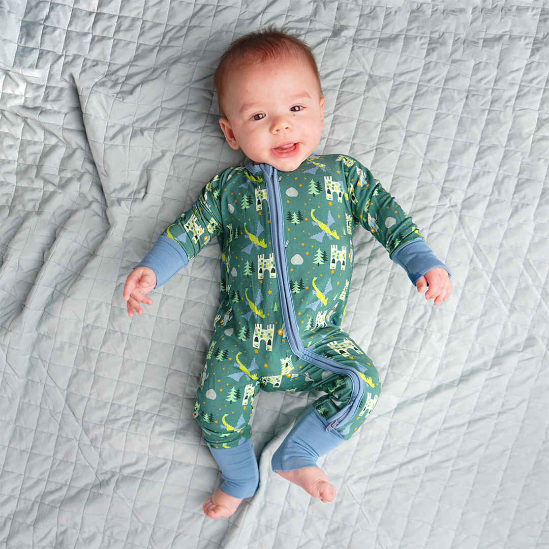 The softest bamboo baby pajamas in our Ever After pattern! Little boys will love this fairy tale themed print full of knights and dragons. Check out more with this print for the cutest sibling match, or pair it with our Once Upon a Time pattern, our fairy tale print for girls!