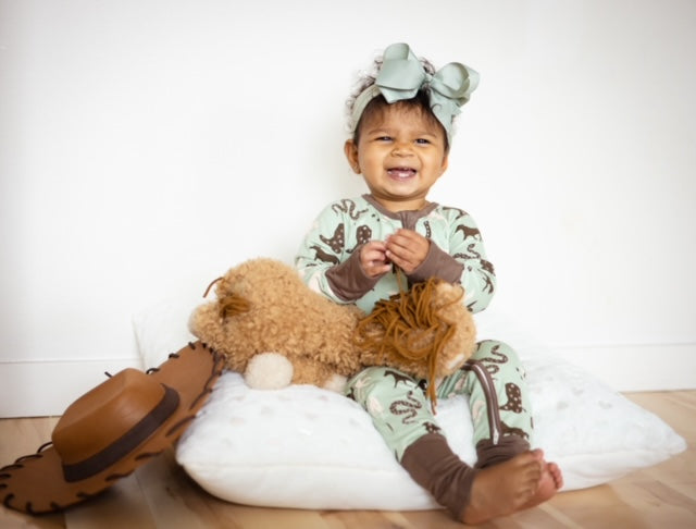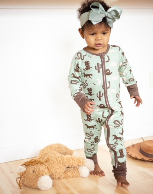 The softest bamboo baby pajamas in our Giddyup pattern! This boho western cowboy print is perfect for Spring and Summer. Check out more with this print for the cutest sibling match!