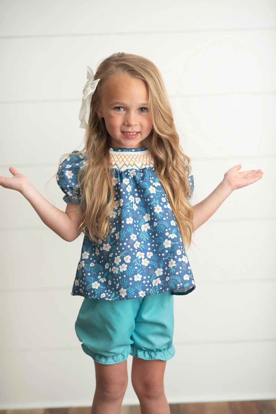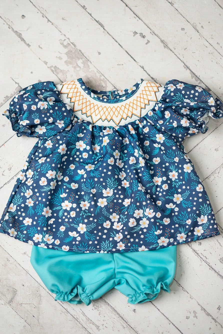 Kids Navy Teal Floral Smocked Teal Spring Easter Bloomer Set