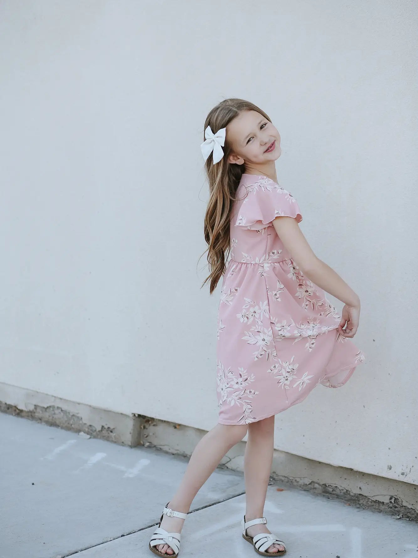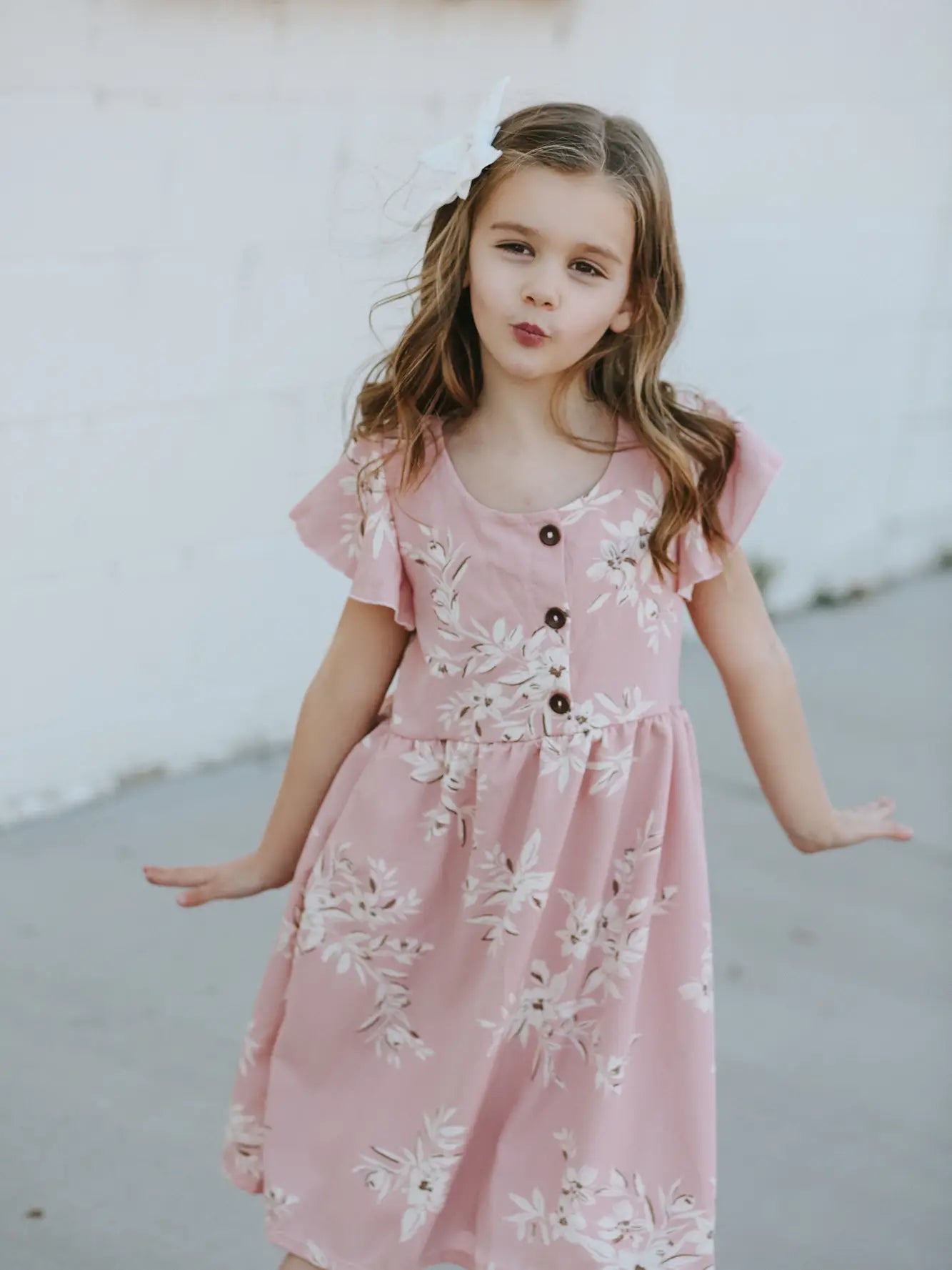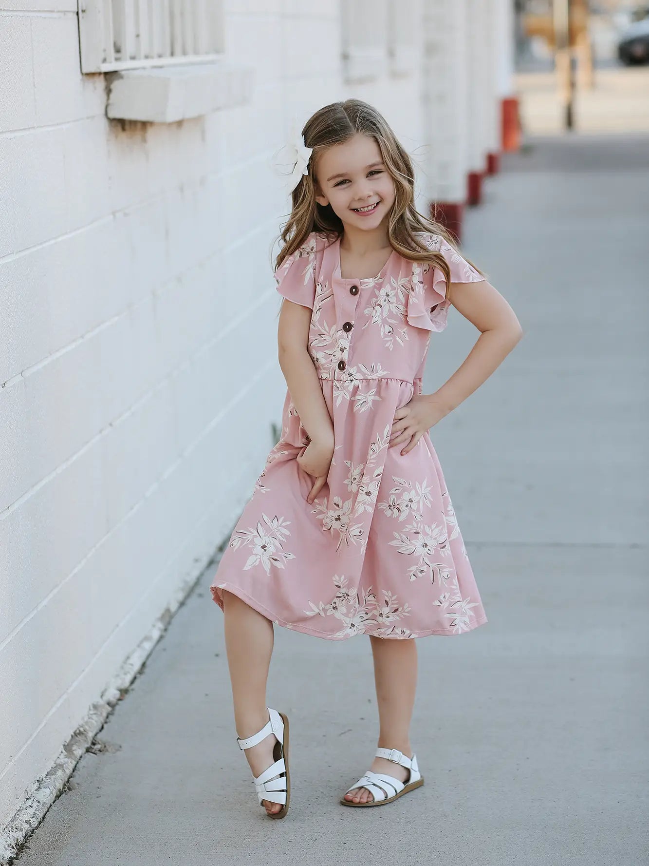 Our Mia Pink Floral Dress features a a fun ruffle sleeve, hidden side pockets, and functional dark wooden buttons down the front. This dress looks so cute with a Ivory or Mocha cardigan layered over the top! Recommended: Machine wash cold, hang to dry, or tumble dry low. Fabric: poly blend Mia Dress 2T 3T 4T 5/6 7/8. 9/10 11/12. 13/14 15/16 Length 21.5'' 23'' 25.5'' 27.5'' 29''. 31'' 34'' 36'' 37.5'' Waist 9.75'' 10'' 11'' 12'' 12.5'' 13'' 14'' 15'' 15.5'' * Waist is measured from side to side laying flat * Length is measured from shoulder to hem.