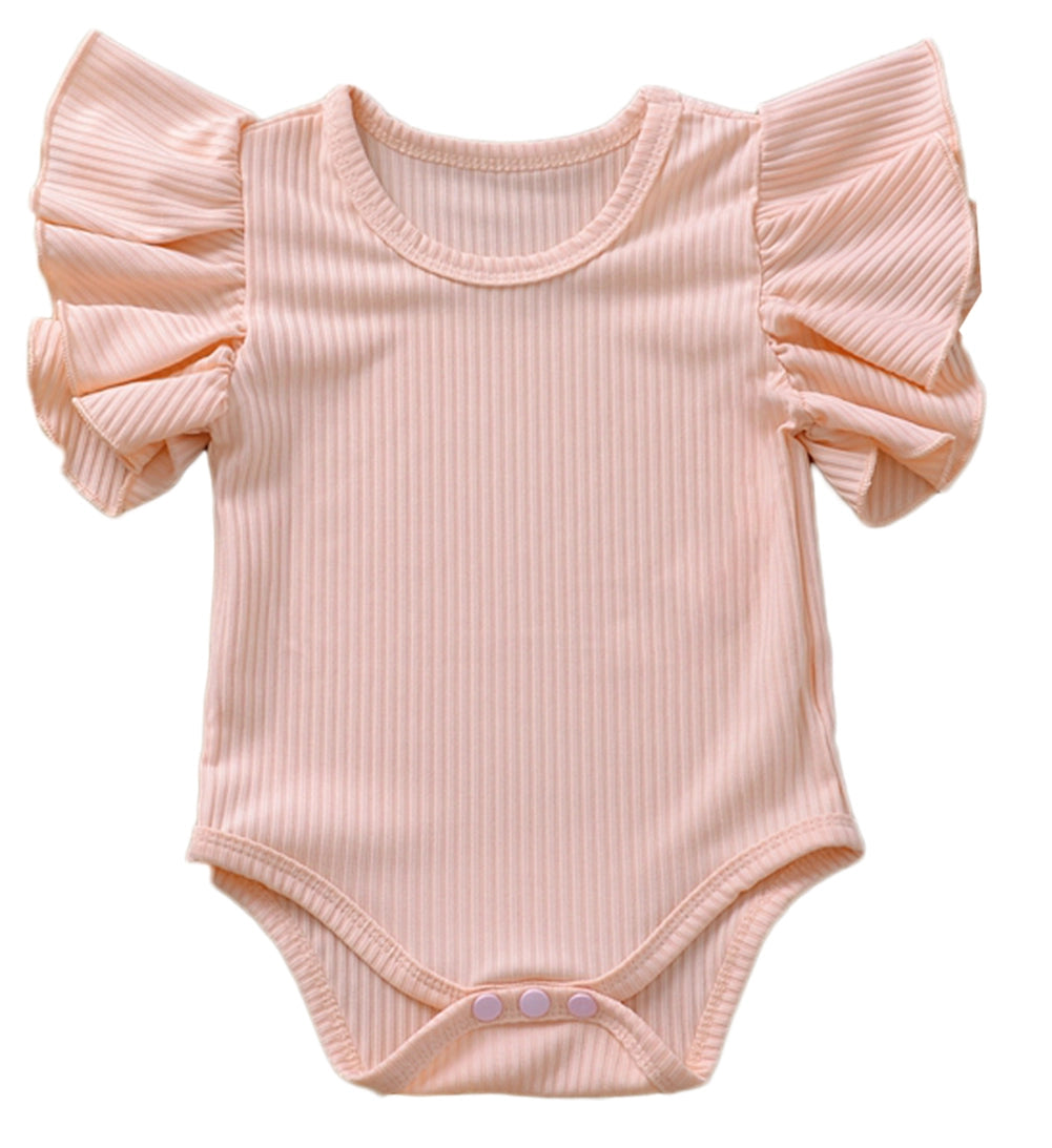 Keep her warm-weather wardrobe updated with this basic ruffle-sleeve romper. This romper, styled with a simple round neck and short ruffle sleeves, adds a sweet pop of style to her casual wardrobe. The button-down closure is easy to use on and off, whether you wear it alone or layer it with leggings or a skirt; this romper will keep her looking cute and cozy for all-day wear.