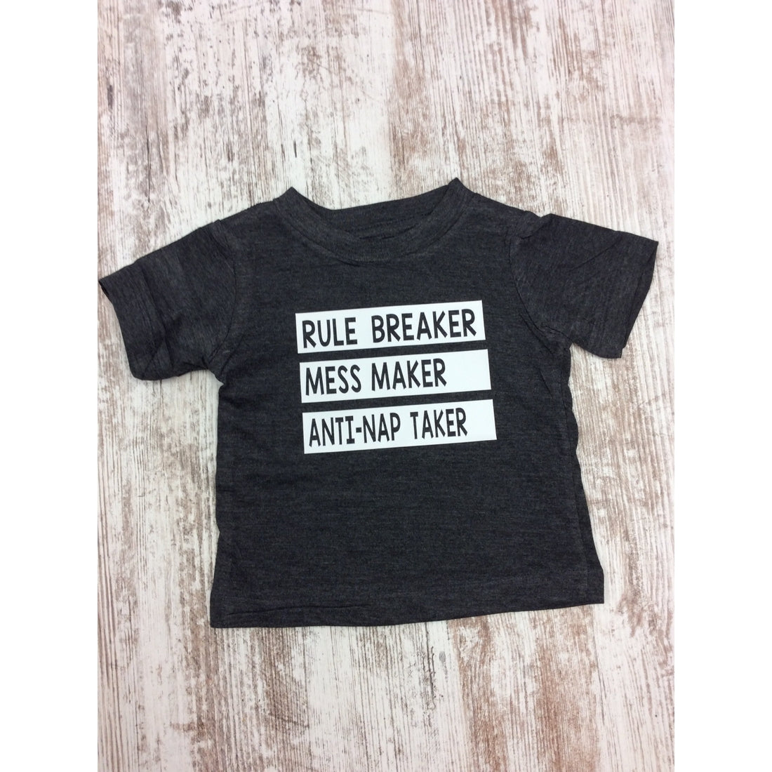 “Rule Breaker, Mess Maker, unit-Nap Taker” applied to a mauve tri-blend Bella + Canvas tee with heat transfer vinyl. i recommend washing these inside out. Tumble dry low or air dry. 52% cotton, 48% polyester