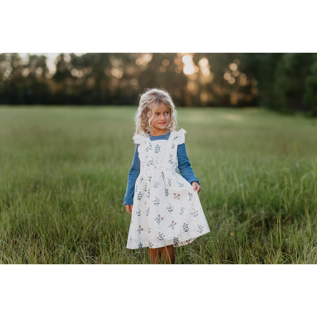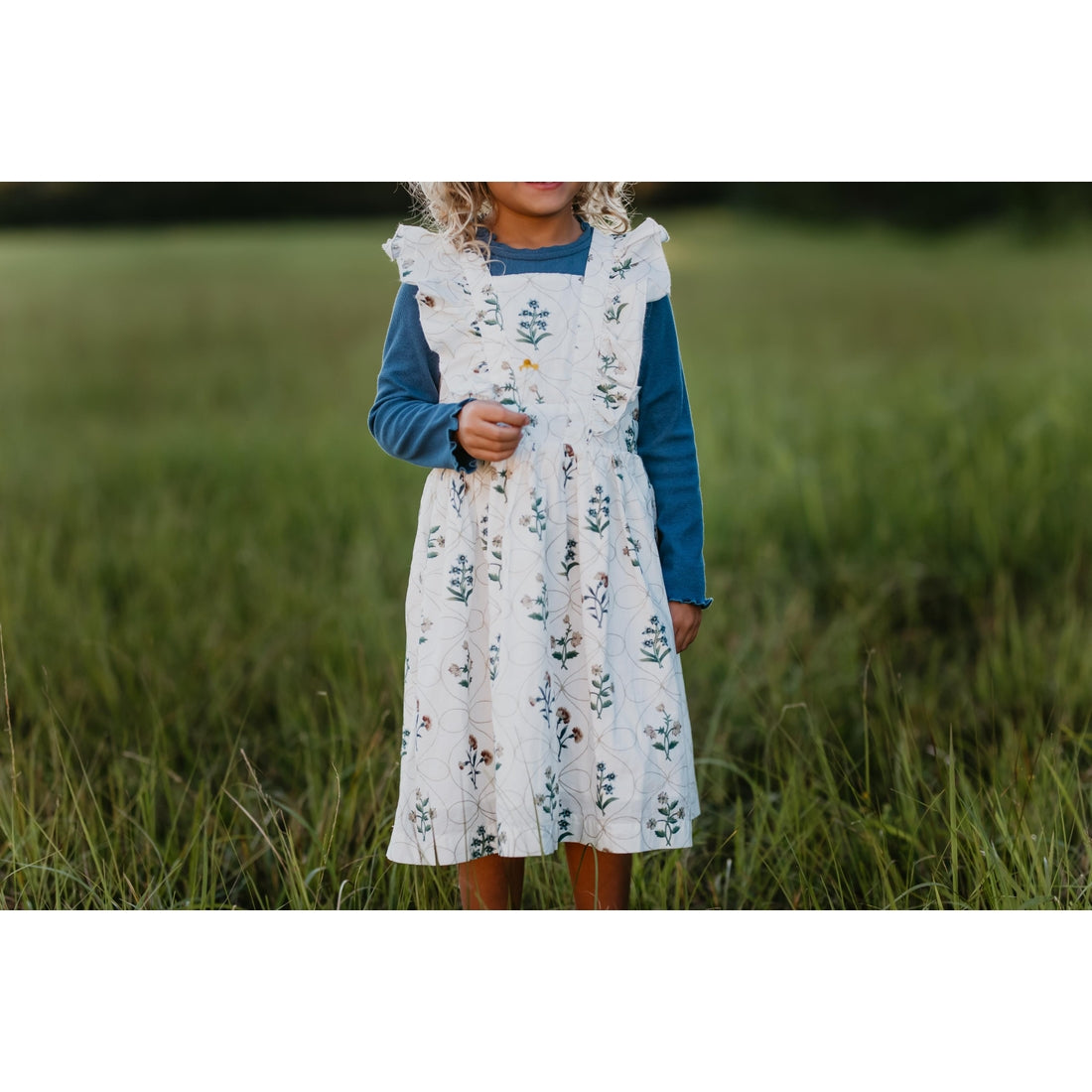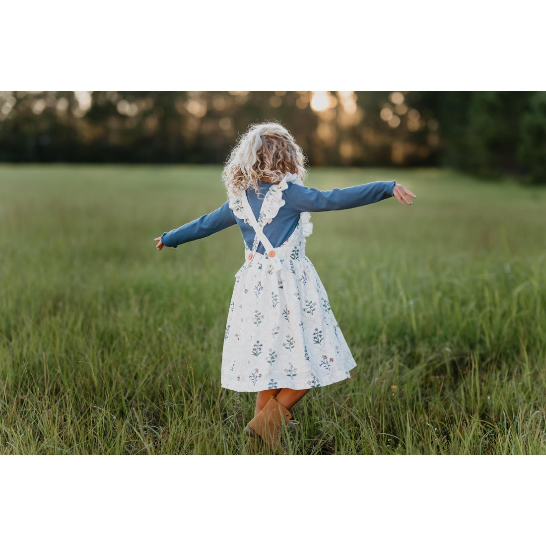 Set includes both pinafore and top This ruffle V formation pinafore has a floral print inspired by antique wallpaper with one-of-a-kind back. Wooden button details. The long sleeve blue lettuce trim top makes a perfect combination for fall weather. Pinafore: 100% Cotton Top: 95% Cotton, 5% Spandex